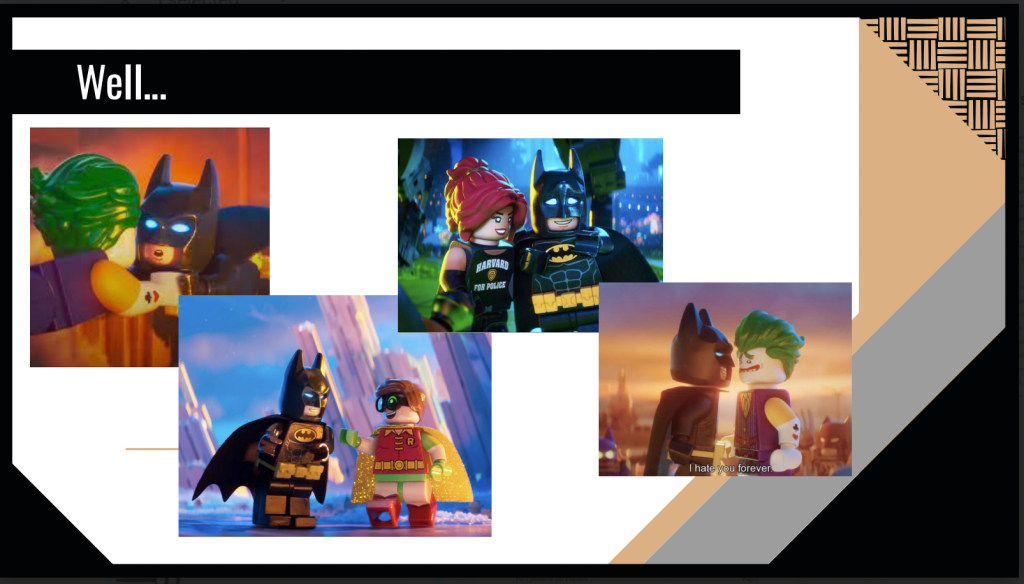 The very point of the film is to tear down Batman’s toxic masculinity, to show that his isolation and his brutality aren’t good traits. It teaches kids that it isn’t wrong to rely on others, or to connect with them, or to be honest about their feelings.